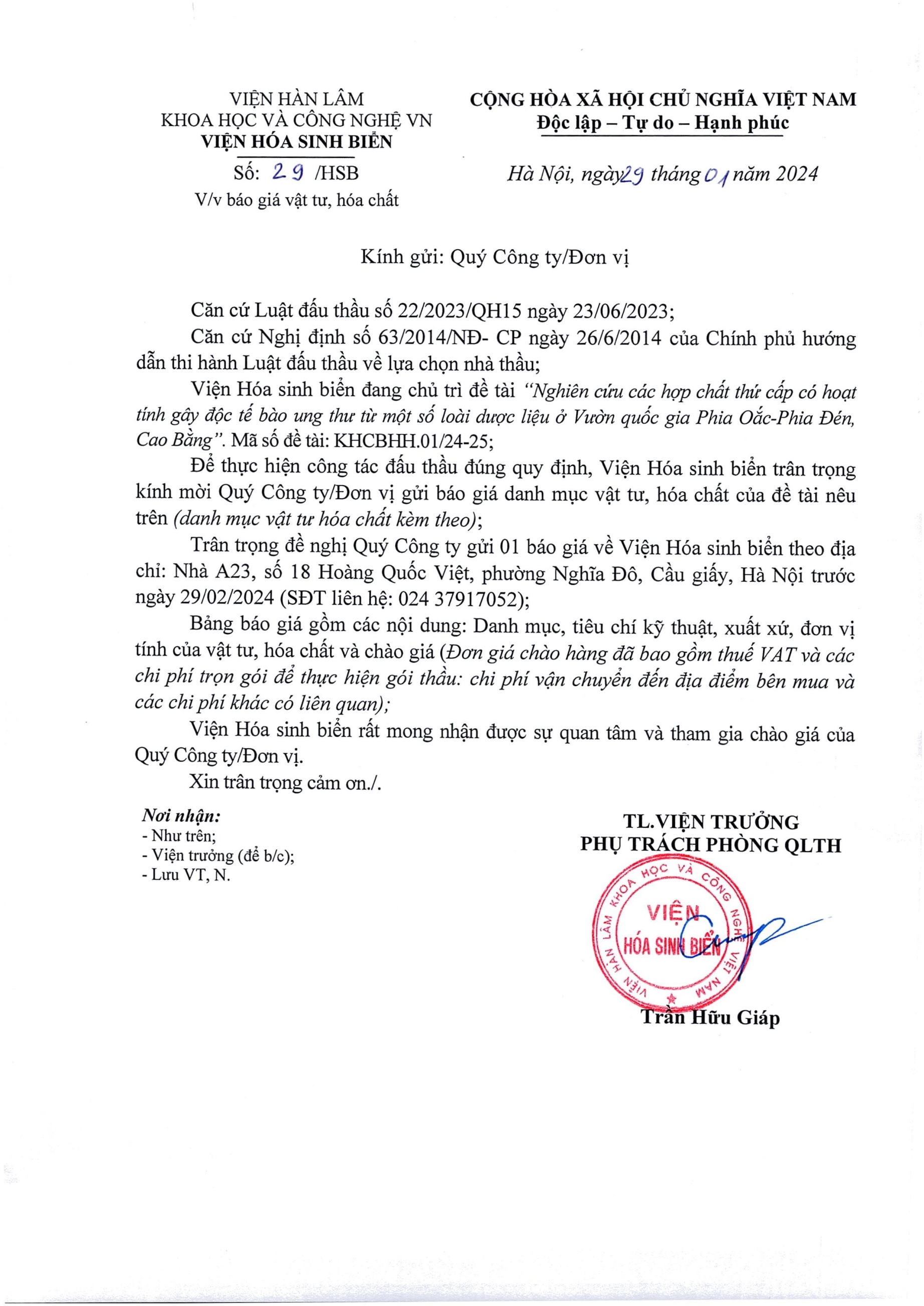 Thư mời báo giá vật tư, hóa chất (Công văn 29/HSB) on 31 Tháng 1 2024. Tải phụ lục chi tiết: Tại đâyCác bài viết khác: Thư mời báo giá vật tư, hóa chất (Công văn 84/HSB) Thư mời báo giá vật tư, hóa chất (Công văn 81/HSB) Thư mời báo giá vật tư, hóa chất (Công văn 80/HSB) Thư mời báo giá vật tư, hóa chất (Công văn 63/HSB) Thư mời báo giá vật tư, hóa chất (Công văn 60/HSB) Thư mời báo giá vật tư, hóa chất (Công văn 59/HSB)