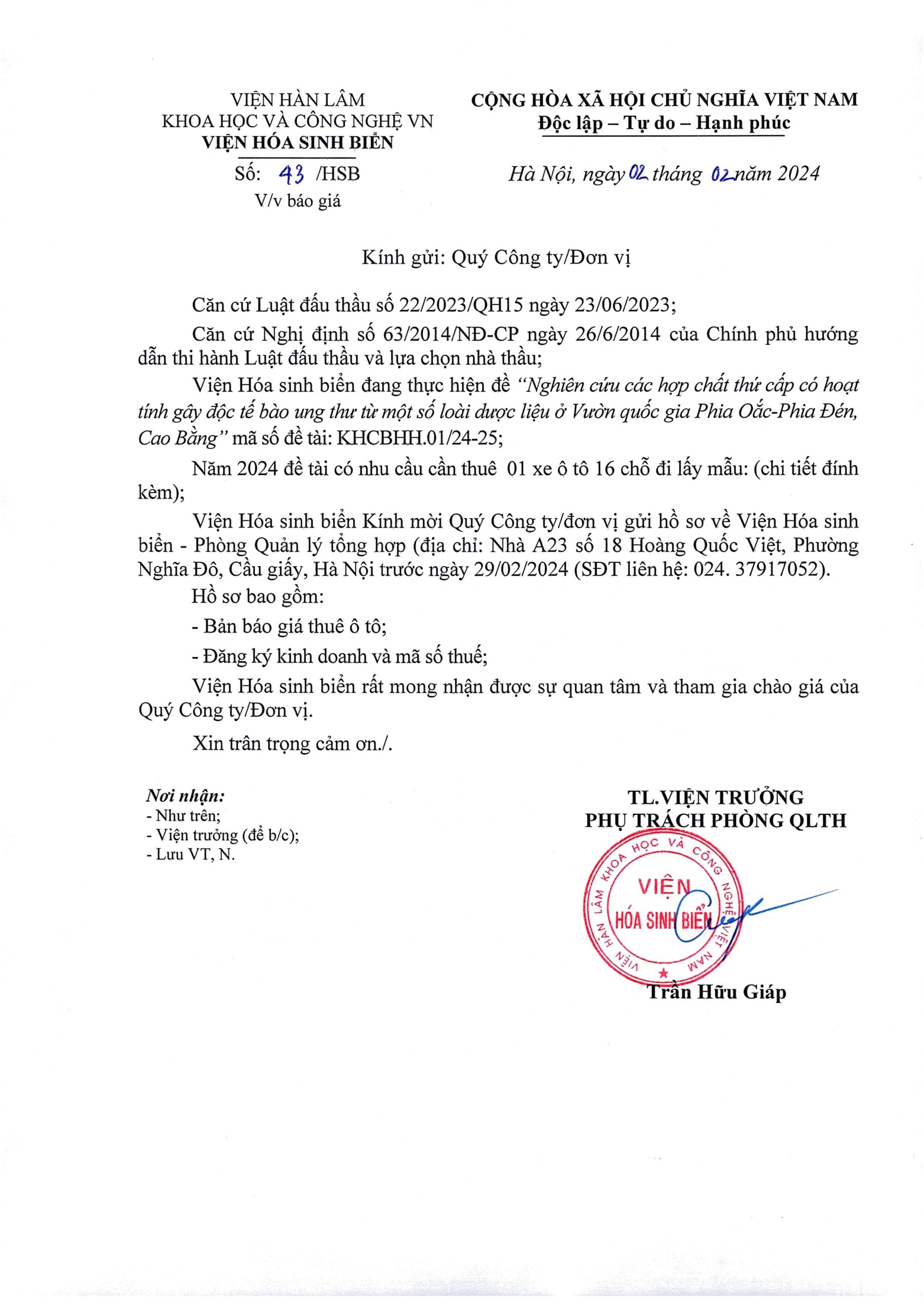 Thư mời báo giá dịch vụ thuê xe ô tô (Công văn 43/HSB) on 02 Tháng 2 2024. Tải phụ lục chi tiết: Tại đâyCác bài viết khác: Thư mời báo giá vật tư, hóa chất (Công văn 84/HSB) Thư mời báo giá vật tư, hóa chất (Công văn 81/HSB) Thư mời báo giá vật tư, hóa chất (Công văn 80/HSB) Thư mời báo giá vật tư, hóa chất (Công văn 63/HSB) Thư mời báo giá vật tư, hóa chất (Công văn 60/HSB) Thư mời báo giá vật tư, hóa chất (Công văn 59/HSB)