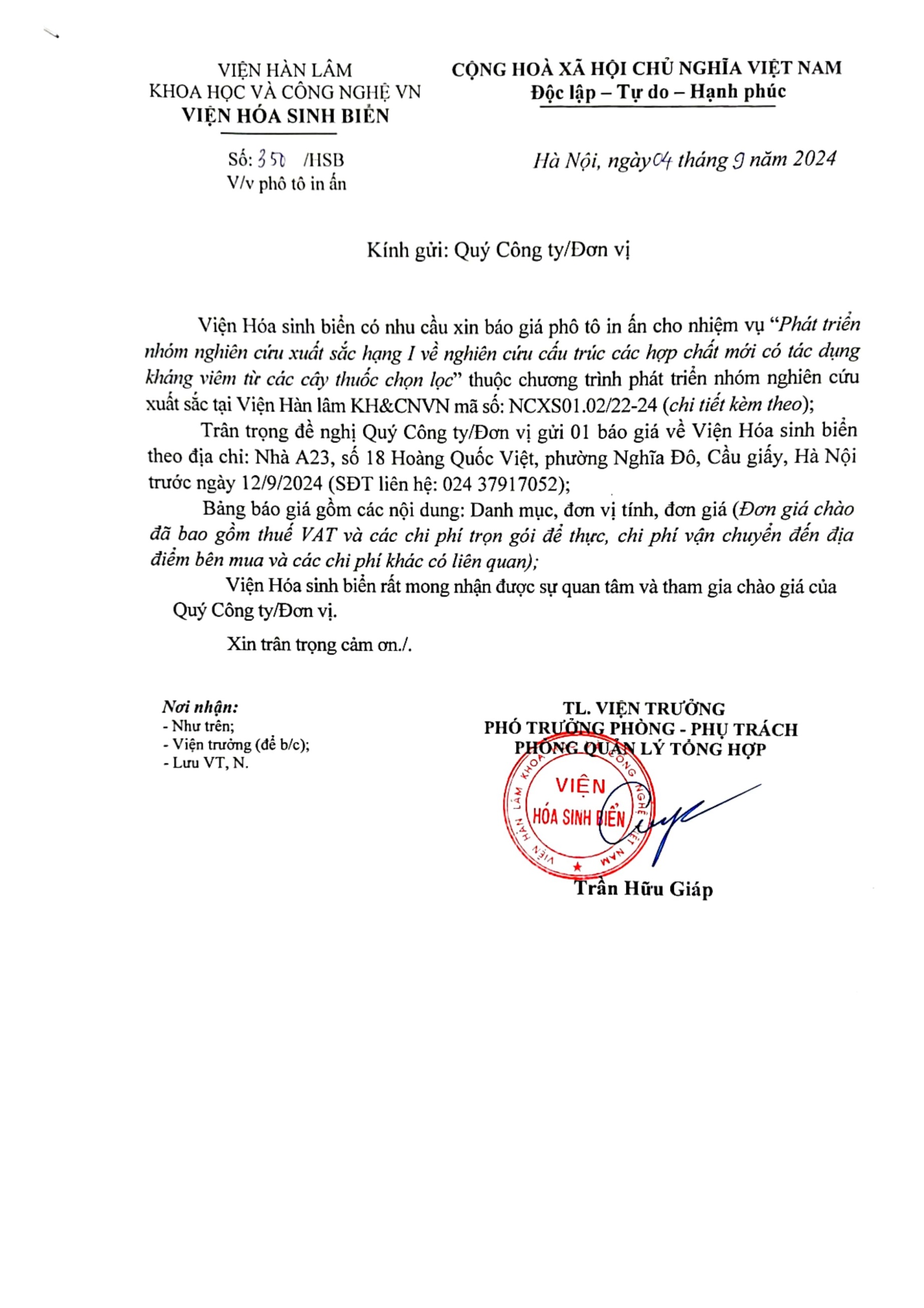 Thư mời báo giá phô tô, in ấn (Công văn 350/HSB) on 04 Tháng 9 2024. Tải phụ lục chi tiết: Tại đâyCác bài viết khác: Thư mời báo giá vật tư, hóa chất (Công văn 84/HSB) Thư mời báo giá vật tư, hóa chất (Công văn 81/HSB) Thư mời báo giá vật tư, hóa chất (Công văn 80/HSB) Thư mời báo giá vật tư, hóa chất (Công văn 63/HSB) Thư mời báo giá vật tư, hóa chất (Công văn 60/HSB) Thư mời báo giá vật tư, hóa chất (Công văn 59/HSB)